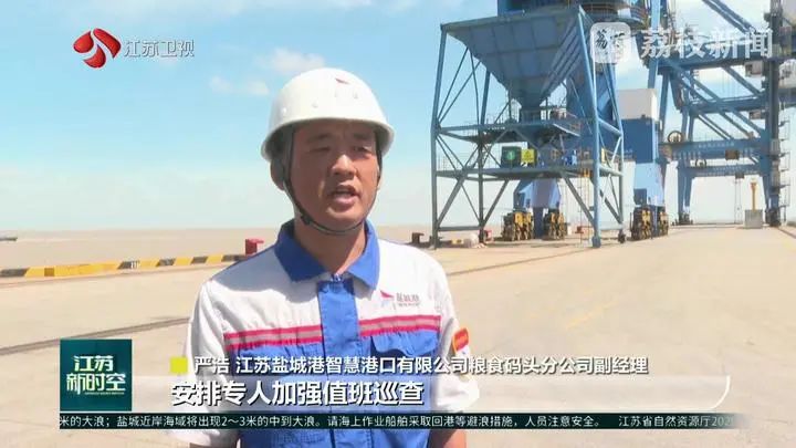 江蘇鹽城港智慧港口有限公司糧食碼頭分公司副經(jīng)理嚴浩說:“安排專人加強值班巡查,全方位、不間斷地排查隱患,確保各項防護措施萬無一失?!?/p>