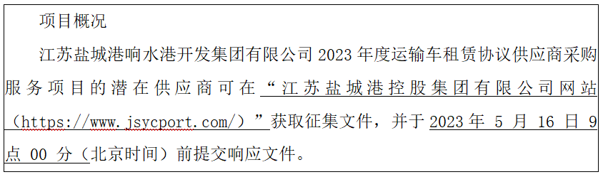 江蘇鹽城港響水港開發(fā)集團(tuán)有限公司現(xiàn)就江蘇鹽城港響水港開發(fā)集團(tuán)有限公司2023年度運(yùn)輸車租賃協(xié)議供應(yīng)商采購服務(wù)項(xiàng)目征集供應(yīng)商,歡迎符合條件的供應(yīng)商參加本次框架協(xié)議采購活動(dòng)。