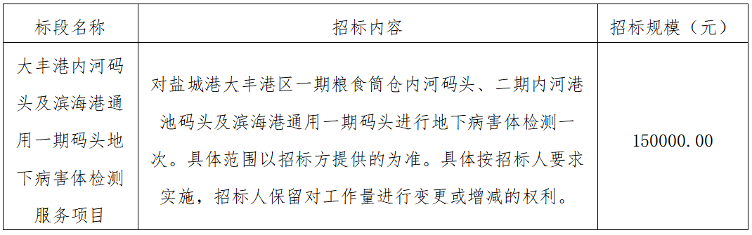 4、招標內容:對鹽城港大豐港區(qū)一期糧食筒倉內河碼頭、二期內河港池碼頭及濱海港通用一期碼頭進行地下病害體檢測一次。