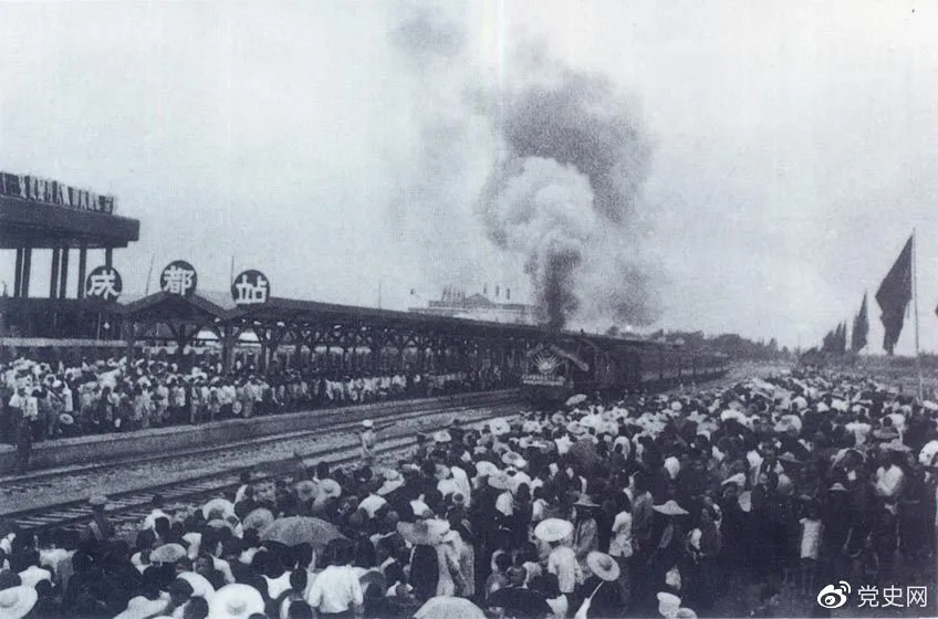 新中國(guó)成立后,在短短的兩年內(nèi)就建成了成渝鐵路。圖為1952年7月1日由成都開(kāi)出的第一列火車(chē)。