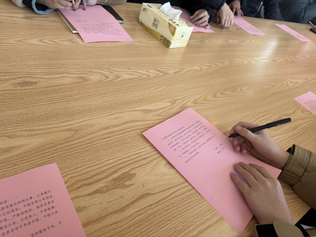 青年們現(xiàn)場簽訂廉潔從業(yè)書并為每位青年送上廉潔日歷及戒尺,進一步強化青年們廉潔自律思想意識,進一步提醒青年們把廉潔承諾轉(zhuǎn)化為工作動力和成效,做遵紀(jì)守法、嚴(yán)格自律的表率,營造風(fēng)清氣正的干事氛圍。