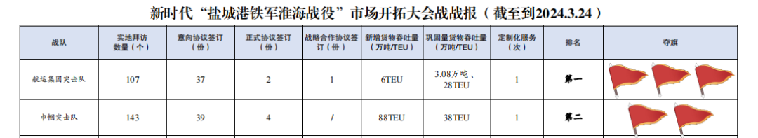 自新時(shí)代“鹽城港鐵軍淮海戰(zhàn)役”市場(chǎng)開拓大會(huì)戰(zhàn)開展以來,航運(yùn)集團(tuán)積極響應(yīng)鹽城港集團(tuán)黨委號(hào)召,成立航運(yùn)集團(tuán)突擊隊(duì)和巾幗突擊隊(duì),持續(xù)深化攬貨拓源,大力弘揚(yáng)“鐵軍精神”,成功實(shí)現(xiàn)市場(chǎng)開拓“新突破”,將定制化、兜底式服務(wù)推向了“新高度”。截至目前,累計(jì)拜訪客戶308家,簽訂意向協(xié)議97份,簽訂正式協(xié)議8份,實(shí)現(xiàn)新增營收超100萬元,集裝箱走量1008TEU。根據(jù)新時(shí)代“鹽城港鐵軍淮海戰(zhàn)役”指揮部第二期戰(zhàn)報(bào),航運(yùn)集團(tuán)包攬集體前兩名,個(gè)人前三名,全力打響“鹽城港鐵軍淮海戰(zhàn)役”市場(chǎng)開拓大會(huì)戰(zhàn)第一槍。