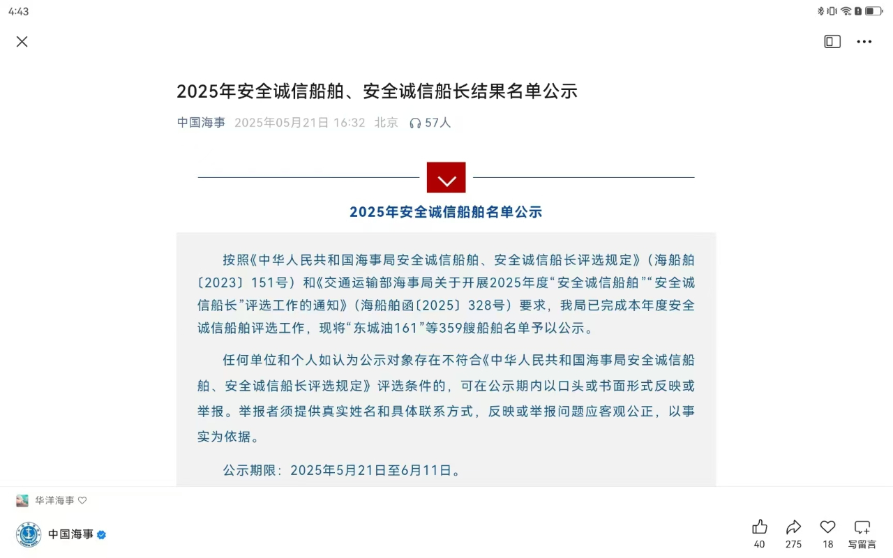 “安全誠信船舶”是國內(nèi)航運(yùn)業(yè)的最高榮譽(yù),由地市級、省級海事管理機(jī)構(gòu)層層篩選,從申請主體的近三至五年的安全檢查、事故險情、違章處罰等各項表現(xiàn)進(jìn)行全面“過篩”,最終由交通運(yùn)輸部海事局組成專門的評選委員會進(jìn)行審查認(rèn)定并向社會公布。獲評該榮譽(yù)的船舶可以享受延長24個月檢查窗口期等一系列便利化措施。