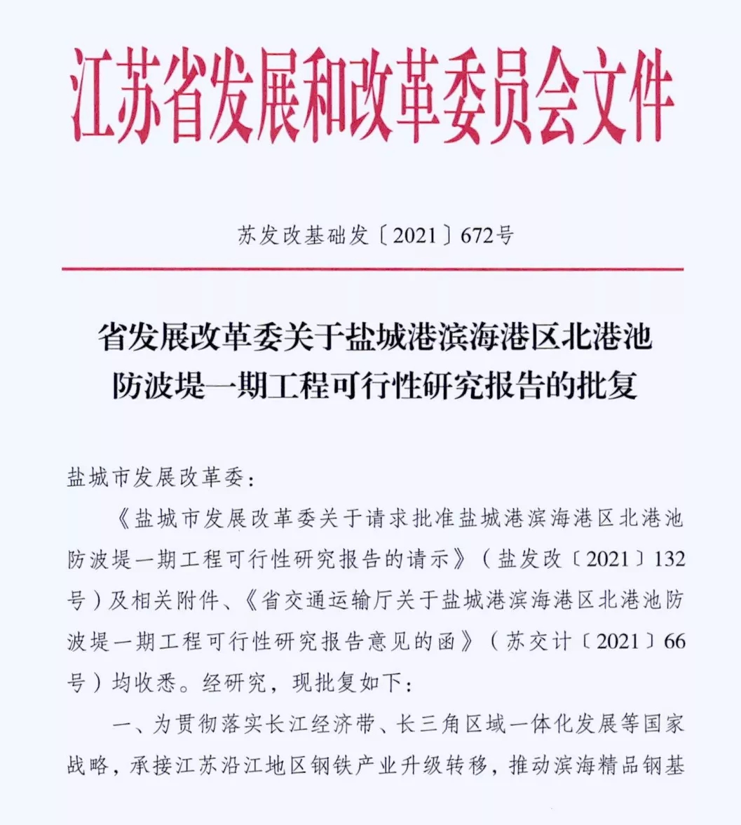 近日,交通運輸部批復鹽城港濱海港區(qū)主港池北區(qū)通用碼頭三期工程使用港口岸線的請示(交規(guī)劃函〔2021〕362號)、省發(fā)展改革委批復鹽城港濱海港區(qū)北港池防波堤一期工程可行性研究報告(蘇發(fā)改基礎(chǔ)發(fā)〔2021〕672號),標志濱海港區(qū)重大項目前期工作取得突破性進展。