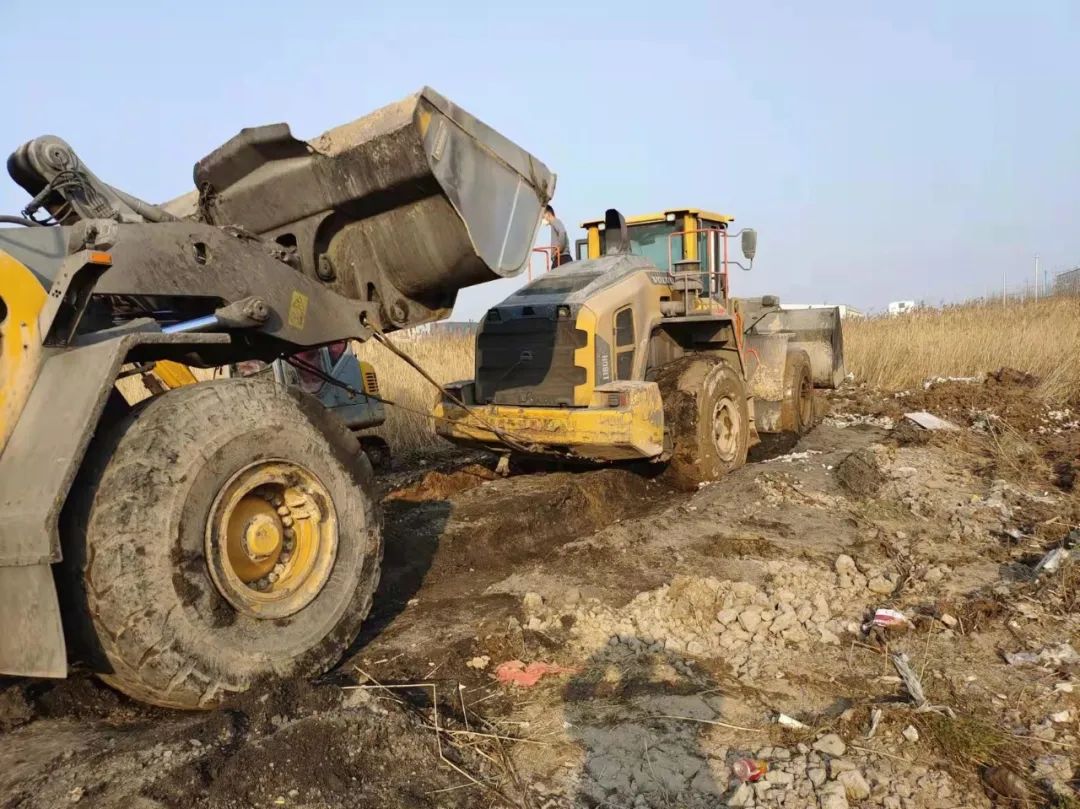 面對(duì)連續(xù)的失敗,響水港區(qū)團(tuán)隊(duì)再次展現(xiàn)出了百折不撓,迎難而上的港口工匠精神,深刻剖析前兩次失敗原因,再次調(diào)集一臺(tái)小型挖機(jī)對(duì)事件車輛輪子周邊淤泥進(jìn)行清理,回填石子提升其自身摩擦力,同時(shí)針對(duì)涉險(xiǎn)裝載機(jī)陷入太深可能造成底盤擱置等情況,調(diào)配一輛裝載機(jī)協(xié)助抬升予以解決,并再次調(diào)集一輛裝載機(jī)采用接力模式增加牽引力。經(jīng)過多臺(tái)機(jī)械的通力配合,受困裝載機(jī)終于在拖拽中緩緩駛出泥潭,圓滿完成救援工作。