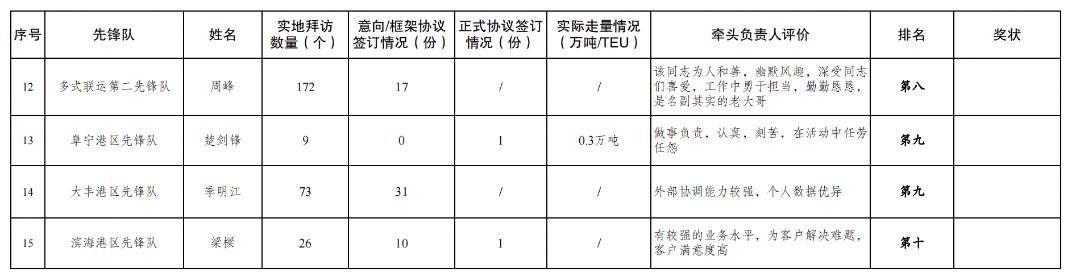 4.實際走量131TEU、23.56萬噸:其中黨員先鋒隊4.85萬噸,射陽港區(qū)先鋒隊4.32萬噸,響水港區(qū)先鋒隊3.84萬噸,航運集團先鋒隊2.79萬噸、86TEU,建湖港區(qū)先鋒隊2.53萬噸,阜寧港區(qū)先鋒隊1.8萬噸,大豐港區(qū)先鋒隊1.21萬噸,亭湖港區(qū)先鋒隊1.2萬噸,濱海港區(qū)先鋒隊1.02萬噸,巾幗先鋒隊45TEU。