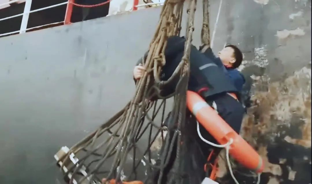 聽聞呼救聲后,碼頭負責人嚴浩當機立斷,一聲令下,立即啟動救人應(yīng)急預案,現(xiàn)場職工陳炳銀、花衛(wèi)軍和高健翔等人迅速、果斷開展救援??紤]到海水溫度低,衣服濕透增加重量后落水者體力消耗極快,無法通過救生繩進行自救,便用救生繩系住救生圈拋至海中進行營救。