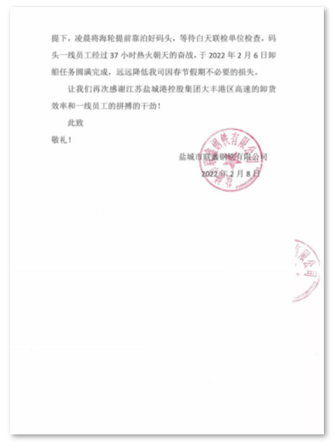 新年伊始,喜事連連。近日,鹽城港大豐港區(qū)港口公司收到鹽城市聯(lián)鑫鋼鐵有限公司送來(lái)的一封感謝信,對(duì)港口公司為客戶著想,以客戶至上,以一流專業(yè)的服務(wù)和生產(chǎn)組織能力、追求卓越的工作精神,高質(zhì)高效幫助客戶圓滿完成卸船任務(wù)表示由衷感謝。