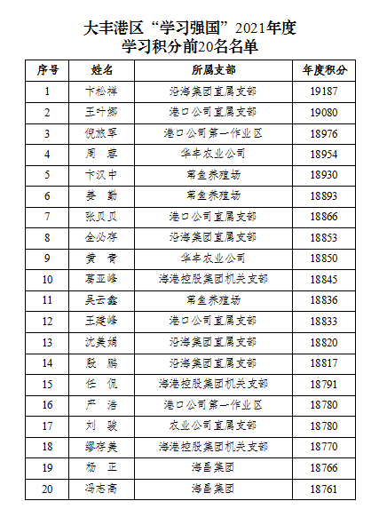 新的一年,為表彰先進、激勵后進,持之以恒地提高港區(qū)全體干部職工的學習自覺性和主動性,進一步加強學習型黨組織建設。近日,大豐港區(qū)舉行“學習強國”2021年度先進個人頒獎儀式,根據(jù)“學習強國”APP大豐港區(qū)年度學習積分排名,對成績突出的前20名“學習達人”代表進行了表彰,并頒發(fā)榮譽證書。