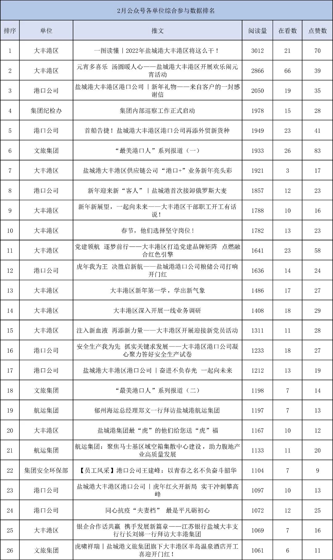 2月榜單,鹽城港集團(tuán)公眾號(hào)“前浪”表現(xiàn)可圈可點(diǎn),“后浪”蓄勢(shì)待發(fā)。這個(gè)2月,是誰遙遙領(lǐng)先?誰又在奮起直追?請(qǐng)看2月榜單!