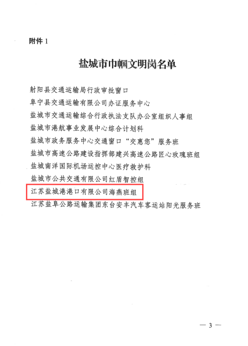 近日,市婦聯(lián)、市交通運(yùn)輸局聯(lián)合發(fā)布《關(guān)于表彰全市交通運(yùn)輸行業(yè)婦女崗位建功先進(jìn)集體(個人)的決定》,鹽城港港口公司“海燕”班組榮獲“鹽城市巾幗文明崗”榮譽(yù)稱號。