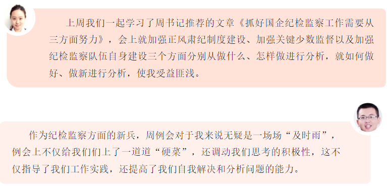 紀檢監(jiān)察業(yè)務周例會是大豐港區(qū)提高紀檢條線工作能力的方式,也是建設學習型紀檢干部的有效嘗試。“學習要有干貨,不能搞花架子,要了解我們的干部最需要學什么,緊貼實際需求和工作要求來安排學習內容?!贝筘S港區(qū)紀檢相關負責人表示,深化監(jiān)察體制改革,對紀檢監(jiān)察干部的業(yè)務能力提出了更高更嚴的要求,學習就是要著力補短板、強弱項,解決紀檢監(jiān)察干部本領“恐慌”問題。例會上,就集團紀委下發(fā)文件精神進行剖析、對日常監(jiān)督如何抓、信息宣傳選題立意、特色亮點提煉歸納進行培訓。會上還提倡“我的問題大家答”,組織交流討論、現(xiàn)場解答,鼓勵善于發(fā)現(xiàn)問題,積極解決問題,創(chuàng)新理念思路,確??梢浴俺潆娧a能”,提升業(yè)務能力。