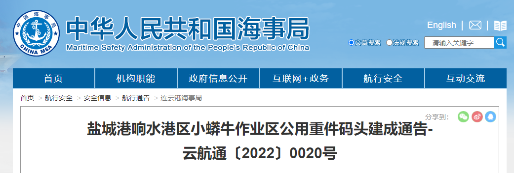 近日,連云港海事局在官網(wǎng)發(fā)布鹽城港響水港區(qū)小蟒牛作業(yè)區(qū)公用重件碼頭建成公告(通航公告)。該碼頭通航運(yùn)營后將打開海河聯(lián)運(yùn)出海通道,有效激活港口樞紐功能,更好統(tǒng)籌協(xié)調(diào)地方發(fā)展。
