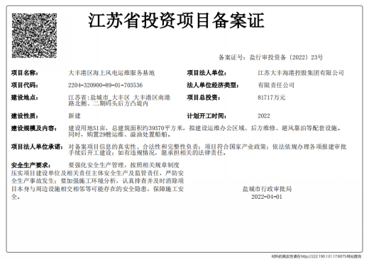 鹽城港大豐港區(qū)海上風(fēng)電運(yùn)維服務(wù)基地項(xiàng)目為市城鄉(xiāng)建設(shè)重點(diǎn)房建項(xiàng)目之一,位于大豐港區(qū)南港路北側(cè)、物聯(lián)大廈東側(cè),二期碼頭后方凸堤內(nèi),建設(shè)用地51畝,建筑面積約39370㎡,項(xiàng)目總投資81717萬元,擬建設(shè)運(yùn)維辦公區(qū)、維修車間、安全培訓(xùn)中心等,后期部分建設(shè)避風(fēng)靠泊等配套設(shè)施;同時(shí)購置29艘運(yùn)維、溢油處置船舶,通過建立運(yùn)維基地,統(tǒng)一運(yùn)維,打造專業(yè)運(yùn)維隊(duì)伍,共享運(yùn)維配套資源及數(shù)據(jù),降低鹽城地區(qū)各個海上風(fēng)電的運(yùn)維成本,促進(jìn)海上風(fēng)電高效運(yùn)行,帶動風(fēng)電產(chǎn)業(yè)鏈的發(fā)展。