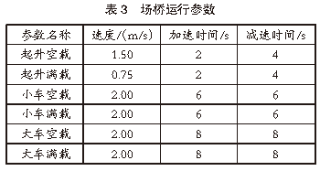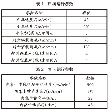 堆場仿真參數(shù):2.1 堆場布局參數(shù)港口裝卸作業(yè)區(qū)布置2個(gè)10萬噸級泊位,每個(gè)泊位配備3臺岸橋,總計(jì)6臺岸橋,編號分別為Crane 1、Crane 2、Crane 3、Crane 4、Crane 5、Crane 6。港口堆場作業(yè)區(qū)規(guī)劃有4個(gè)箱區(qū),編號分別為E01、E02、E03、E04。在堆場布置方面,E01箱區(qū)為近海側(cè)箱區(qū),E04箱區(qū)為近陸側(cè)箱區(qū),E01、E02箱區(qū)為出口箱區(qū),E03、E04箱區(qū)為進(jìn)口箱區(qū)。在港口堆場作業(yè)區(qū)規(guī)劃中,將E01箱區(qū)設(shè)置為9列5層箱區(qū),E02、E03、E04箱區(qū)設(shè)置為12排5層箱區(qū),每個(gè)箱區(qū)配備有2臺場橋協(xié)同作業(yè),總計(jì)8臺場橋,編號分別為A01、A02、A03、A04、A05、A06、A07、A08。2.2 堆場設(shè)備參數(shù)港口堆場作業(yè)設(shè)備主要包括場橋、岸橋、集卡等,上述設(shè)備的運(yùn)行參數(shù)即為堆場仿真系統(tǒng)的輸入?yún)?shù)。根據(jù)實(shí)際集裝箱堆場作業(yè)數(shù)據(jù),對作業(yè)設(shè)備進(jìn)行參數(shù)設(shè)置。岸橋運(yùn)行參數(shù)見表1,集卡運(yùn)行參數(shù)見表2,場橋運(yùn)行參數(shù)見表3。