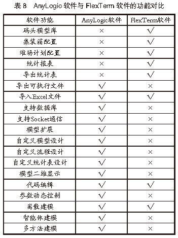 通過仿真分析結(jié)果與實(shí)際作業(yè)數(shù)據(jù)的對比發(fā)現(xiàn),仿真分析結(jié)果與港口實(shí)際運(yùn)行數(shù)據(jù)差距較小,表明AnyLogic仿真模型和FlexTerm仿真模型都能準(zhǔn)確可靠地模擬港口實(shí)際堆場作業(yè)情況,能夠滿足港口堆場仿真需求,并有助于提高港口堆場仿真的準(zhǔn)確度和可信度。此外,通過分析堆場仿真作業(yè)流程還發(fā)現(xiàn),通過調(diào)整堆場仿真系統(tǒng)的輸入條件能提升AnyLogic仿真模型和FlexTerm仿真模型的仿真效果,其中:通過調(diào)整輸入條件對應(yīng)的關(guān)鍵參數(shù)來提升AnyLogic仿真模型的仿真效果;通過修改輸入條件中作業(yè)計(jì)劃模塊的船期、堆場計(jì)劃等相關(guān)配置來提升FlexTerm仿真模型的仿真效果。4.3 軟件功能對比回顧整個(gè)堆場仿真作業(yè)流程發(fā)現(xiàn),2款軟件在功能應(yīng)用方面存在一定差異。根據(jù)仿真作業(yè)流程和仿真分析結(jié)果,對2款軟件的功能進(jìn)行對比分析,AnyLogic軟件與FlexTerm軟件的功能對比見表8。