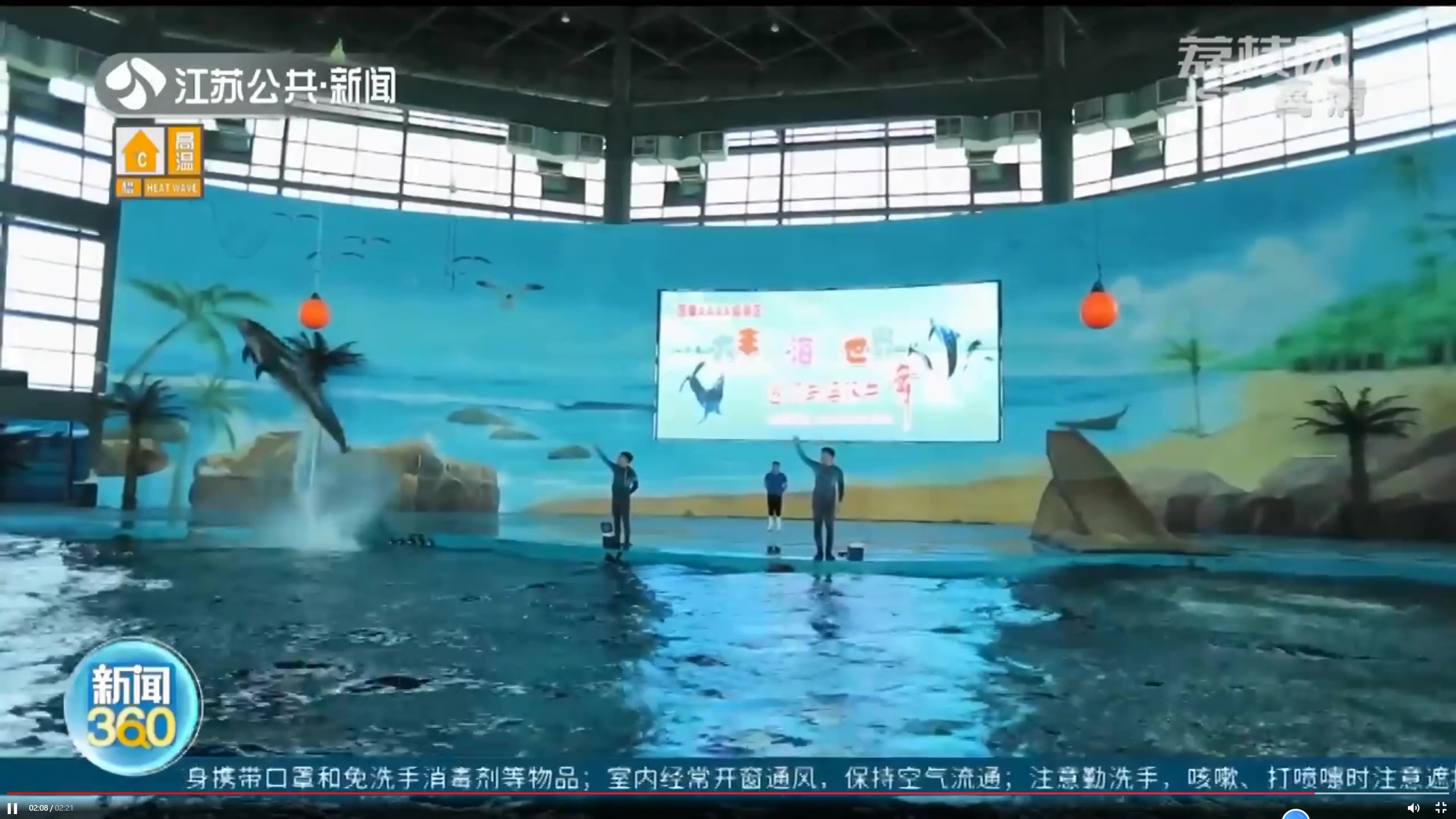 新聞中展示了鹽城港海洋館內(nèi)的馴養(yǎng)員與海豚互動表演,馴養(yǎng)員時而騎在海豚身上,讓海豚在水池中快速滑翔,時而指揮海豚,讓海豚在水池中高高躍起擊中懸掛的氣球,憨態(tài)可掬又靈活精怪的海豚帶來的精彩表演引來現(xiàn)場觀眾陣陣喝彩。