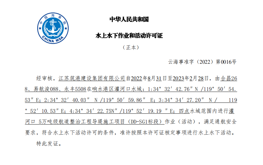 8月30日至31日,連云港海事局陸續(xù)簽發(fā)灌河口5萬噸級(jí)航道整治工程導(dǎo)堤施工一標(biāo)段和二標(biāo)段水上水下活動(dòng)許可證,標(biāo)志導(dǎo)堤工程施工前手續(xù)全部完成,為灌河口5萬噸級(jí)航道整治工程的全面開展邁出了重要一步。