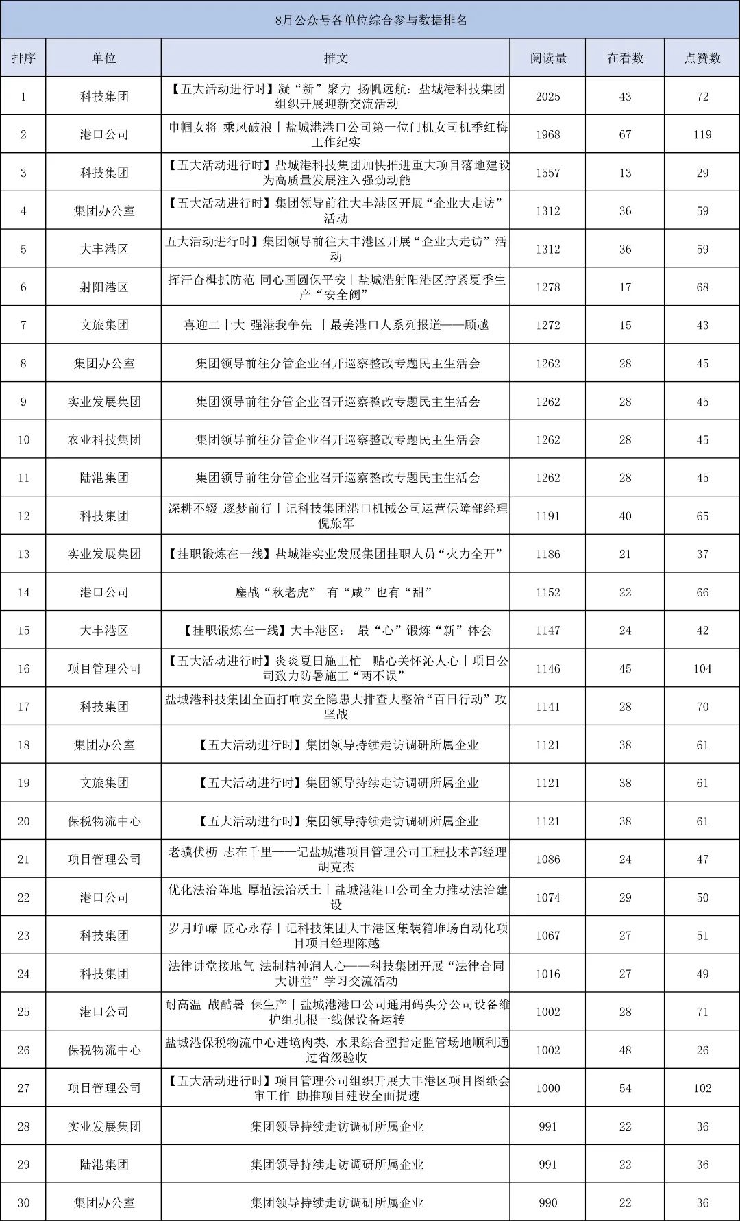 告別熱情似火的8月,迎來天高云淡的9月,鹽城港微信公眾號8月份排行榜又如期而至,與大家見面了。與7月份榜單相比,8月份榜單有哪些變化呢?我們一起來看看。