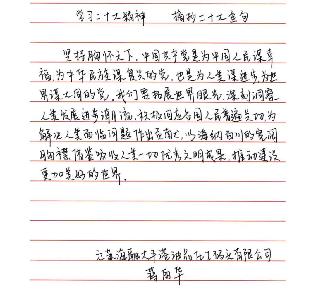 為深入學習宣傳貫徹黨的二十大精神,切實把思想和行動統(tǒng)一到黨的二十大精神上來,使黨員干部做到“學原文、悟原理、知原義”。近日,江蘇大豐港和順科技股份公司黨支部組織開展手抄黨的二十大報告“金句”活動,黨員干部積極參加、以筆抒懷,用特別的方式書寫對黨的赤誠忠心。