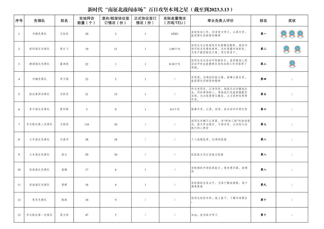 第一名:巾幗先鋒隊 王怡秋(拜訪客戶29家、簽訂意向協(xié)議3份,簽訂正式協(xié)議1份,實際走量6TEU)