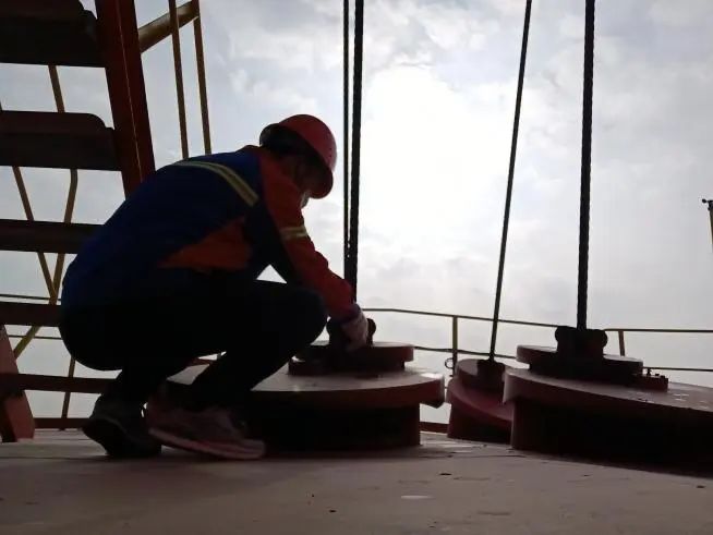 為契合“千匯018”7片118米葉片裝船,制定作業(yè)方案時已綜合考慮,其中點(diǎn)位觀測是重點(diǎn)環(huán)節(jié)也是撓頭的工作,誤差系數(shù)不能>0.05M,GPS測距儀雖然方便,但碼頭信號弱、光學(xué)量距點(diǎn)位信息混淆且誤差大。通過現(xiàn)場大家積極查閱相關(guān)資料,想出了“小妙招”,運(yùn)用“墊1架3側(cè)3”疊碼法,既創(chuàng)新了創(chuàng)新工藝方法,用最簡單的工具發(fā)揮最大的效能;又探索出新的非標(biāo)裝船模式,滿足了客戶的需求。
