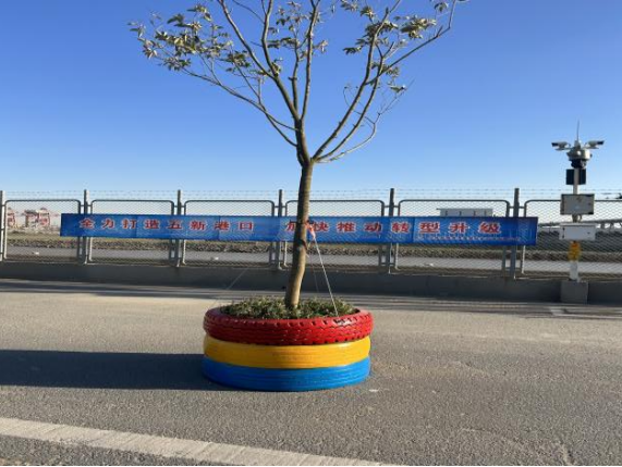 針對地磅站臺位置地處碼頭邊緣的現(xiàn)狀,為有效防止車輛在運(yùn)輸或掉頭拐彎過程中,誤闖碼頭或誤滑海域等安全隱患,開展“修舊利廢”行動,誤闖碼頭或誤滑海域等安全隱患,踐行“修舊利廢”行動,利用2套支座、4根Φ40的廢舊鋼絲繩,支座選用預(yù)埋定位螺栓,高標(biāo)號水泥澆筑固定,制作一套安全防護(hù)車擋;利用廢舊輪胎循環(huán)制作路邊安全警示“盆景”;聚焦修舊利廢“小舉措” 實(shí)現(xiàn)提質(zhì)增效“大提升”。