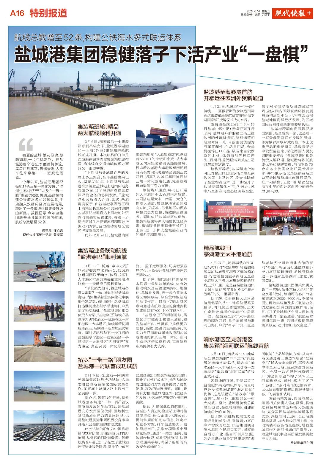 該航線是繼2023年6月16日鹽城中歐(亞)接續(xù)班列開(kāi)行以來(lái),鹽城港開(kāi)辟的第二條運(yùn)往歐洲的外貿(mào)新通道,航線運(yùn)營(yíng)初期為兩周一班,目前主要貨源為汽車(chē)零配件、生活日用品、柴油機(jī)械等出口產(chǎn)品,以及來(lái)自俄羅斯的木材、熱銷商品等進(jìn)口產(chǎn)品,后期根據(jù)貨源集聚效應(yīng),適時(shí)增加班次密度。
