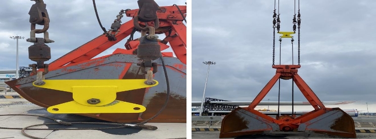 日常門機散貨裝卸過程中,鋼絲繩受失重影響大幅甩動致相鄰鋼絲繩纏繞,產(chǎn)生劇烈摩擦,影響起重機械的工作效率,最終導致捻距被破壞。設備班組總結(jié)、創(chuàng)新制作門機主鋼絲繩平衡防纏繞裝置,在門機開閉兩根鋼絲繩的兩端和抓斗鋼絲繩的兩端,用卸扣豎向連接,橫向支撐、縱向承載,杜絕鋼絲繩纏繞,延長使用壽命,確保設備高效運轉(zhuǎn)。