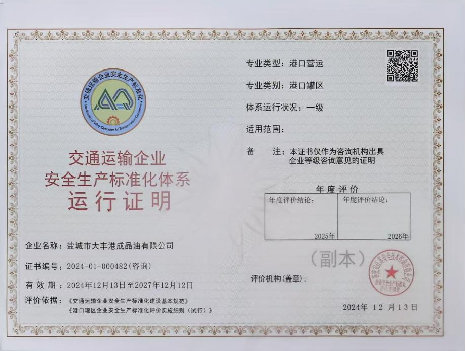 近日,鹽城港大豐港區(qū)成品油公司順利取得“通運(yùn)輸企業(yè)安全生產(chǎn)一級(jí)標(biāo)準(zhǔn)化證書(shū)”,標(biāo)志著成品油公司在安全生產(chǎn)管理體系精細(xì)化、規(guī)范化、標(biāo)準(zhǔn)化建設(shè)上實(shí)現(xiàn)了提質(zhì)升級(jí)。