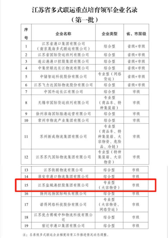 近日,江蘇省交通運輸廳出臺《江蘇省推動多式聯(lián)運企業(yè)梯度培育工作方案》,并公布第一批19家重點培育企業(yè)名錄。鹽城港集團憑借在多式聯(lián)運領(lǐng)域的突出成績和顯著發(fā)展?jié)摿?,成功入選“江蘇省多式聯(lián)運重點培育領(lǐng)軍企業(yè)名錄(專業(yè)型)”。