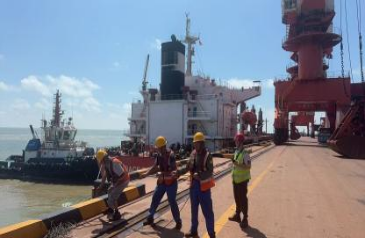 正午驕陽炙烤,地面溫度節(jié)節(jié)攀升。調(diào)度員的工作服早已被汗水浸透,緊貼脊背,但他們沒有絲毫懈怠,不停穿梭于碼頭前沿,實時調(diào)配生產(chǎn)資源?!芭_風(fēng)預(yù)警,今晚22點前必須卸空離泊避風(fēng)!”調(diào)度員抹去額角的汗珠,目光如釘般鎖定作業(yè)進(jìn)度,確??崾钪卵b卸效率不降分毫。