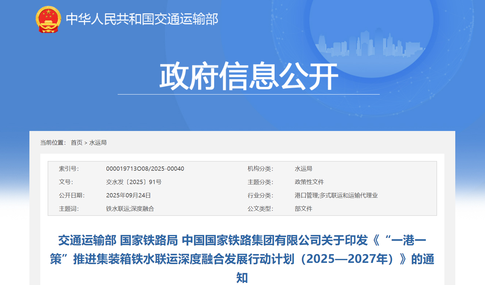 為深入貫徹落實黨中央、國務(wù)院決策部署,優(yōu)化調(diào)整運輸結(jié)構(gòu),進(jìn)一步發(fā)揮綜合運輸優(yōu)勢,促進(jìn)有效降低全社會物流成本,現(xiàn)將《“一港一策”推進(jìn)集裝箱鐵水聯(lián)運深度融合發(fā)展行動計劃(2025—2027年)》印發(fā)給你們,請認(rèn)真抓好落實。