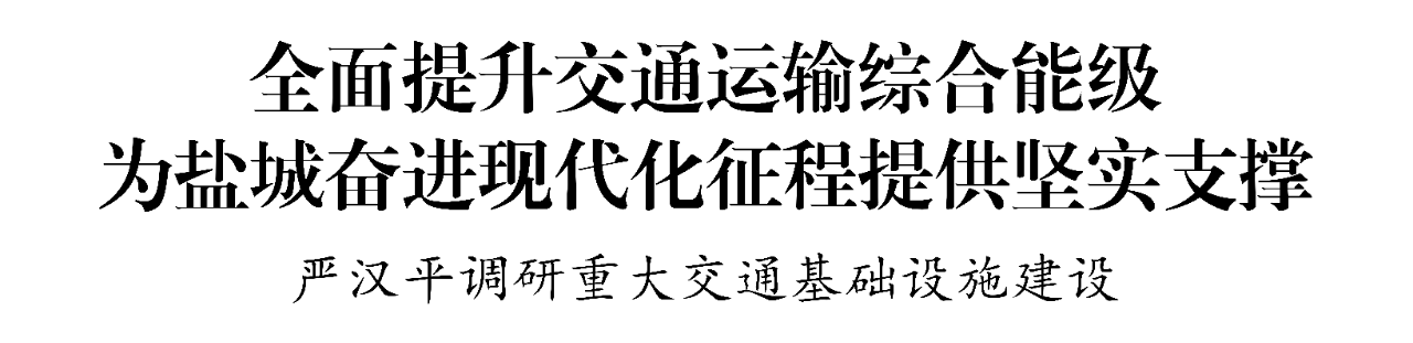 10月29日下午,市長(zhǎng)嚴(yán)漢平調(diào)研我市重大交通基礎(chǔ)設(shè)施建設(shè)工作,強(qiáng)調(diào)要深入學(xué)習(xí)貫徹黨的二十屆四中全會(huì)精神和習(xí)近平總書(shū)記關(guān)于交通強(qiáng)國(guó)的重要論述,高質(zhì)高效推動(dòng)重大交通基礎(chǔ)設(shè)施項(xiàng)目建設(shè),加快構(gòu)建內(nèi)暢外聯(lián)交通運(yùn)輸體系,為鹽城奮進(jìn)現(xiàn)代化征程提供堅(jiān)實(shí)支撐。