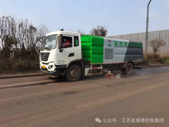 灑水車來(lái)回穿梭于港區(qū)道路上