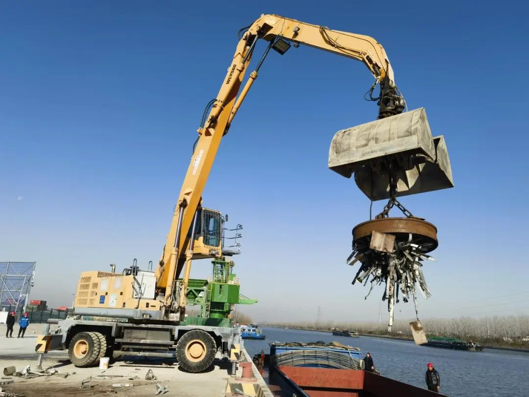 為切實解決作業(yè)效率低下的問題,亭湖港區(qū)調度組與創(chuàng)新團隊多次研究,最終確定使用抓料機作業(yè),同時為防止抓料機抓取廢鋼對抓斗造成損傷,團隊還特別制定抓料機改造方案,通過兩根定制鋼絲繩將電磁吸盤安裝到抓料機抓斗下方,并通過電纜線路改造,抓料機駕駛員可以在駕駛抓料機的同時操控吸盤。由于抓料機的靈活機動,可以自由伸縮抓臂,作業(yè)現(xiàn)場不再需要裝載機司機的參與。自改造實施后,港區(qū)廢鋼生產作業(yè)耗時耗力的難題得到了有效解決,極大地提高了港區(qū)生產運營效率,該項改進創(chuàng)新在保證安全的基礎上,共節(jié)省人工2名,作業(yè)時長由4天節(jié)省為2天,作業(yè)效率提高50%。