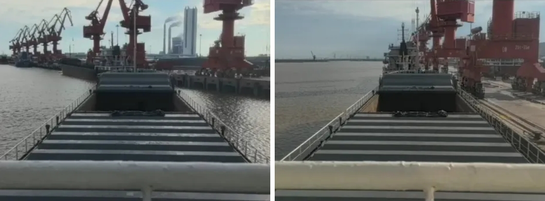 為確保船舶能夠在無拖輪的情況下安全靠港,引航員在充分結(jié)合碼頭的生產(chǎn)調(diào)度現(xiàn)狀的基礎(chǔ)上,根據(jù)引航手持設(shè)備,直觀水文條件與航道情況,為避免低平潮淺水效應(yīng),根據(jù)船舶特性,利用風(fēng)流壓與車、舵、錨、纜相結(jié)合,采用拋錨拉大角度船頭靠泊的方式進港,在引航員精湛的技藝之下,船尾與泊位周邊浮筒擦肩而過,完美地進入碼頭范圍。在主控室中,不斷下達車速與舵角的操作指令,在湍急的岸邊水流中不斷拉扯船舶與碼頭的位置,最終在碼頭工人拉緊最后一根纜繩的同時完成本次靠港任務(wù)。
