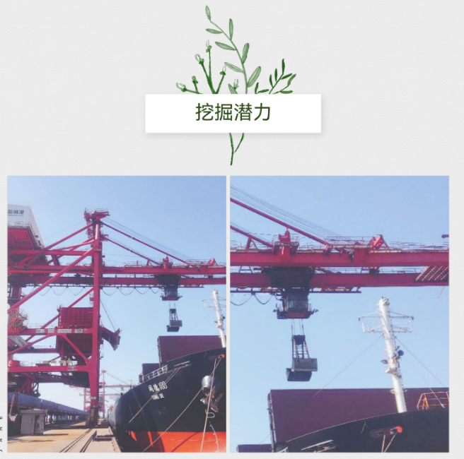 深入挖掘設備潛能,實施了一系列“賦能升級”計劃。改進卸船機水渣抓斗工藝,從原有的14m3、21T的水渣抓斗采購16.9m3、25T的抓斗,使其在滿足額定起重量要求的同時,具備煤炭備用抓斗的功能;對堆料機進行流量升級,通過改造漏斗、支架等細節(jié),平均流量從1800T/H提升至2200T/H,在提高堆料機的穩(wěn)定性和效率的同時,也降低了新設備采購的成本。