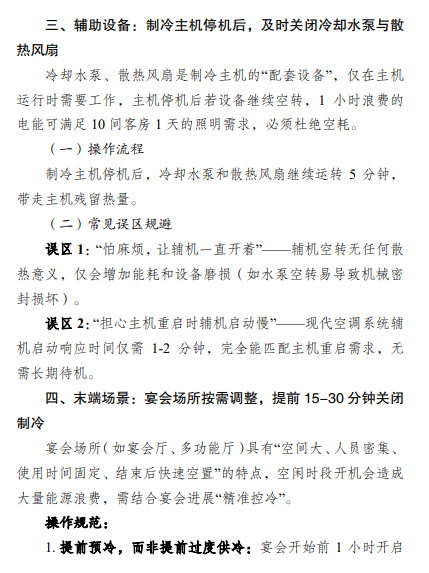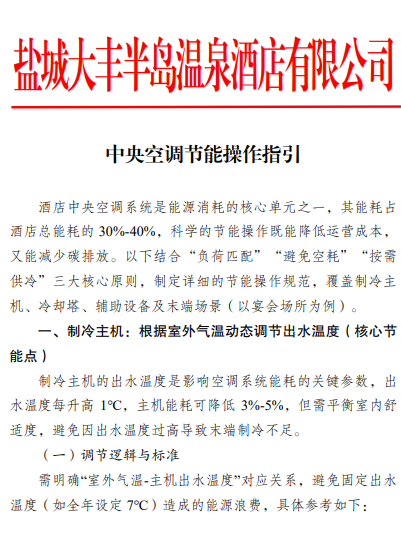 酒店專門編制空調節(jié)能操作指南,圍繞“負荷匹配、避免空耗、按需供冷”三大原則,通過靈活調節(jié)水溫、分時運行風機、合理預判宴會需求等方式,從設備運行到場景適配全流程優(yōu)化,節(jié)電效果顯著。