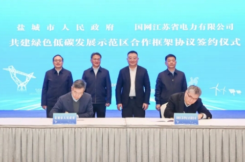1月4日,鹽城市政府與國網(wǎng)江蘇省電力有限公司簽署共建綠色低碳發(fā)展示范區(qū)合作框架協(xié)議。市委書記周斌,市委副書記、市長張明康會見國網(wǎng)江蘇電力董事長謝永勝一行,并共同見證簽約。