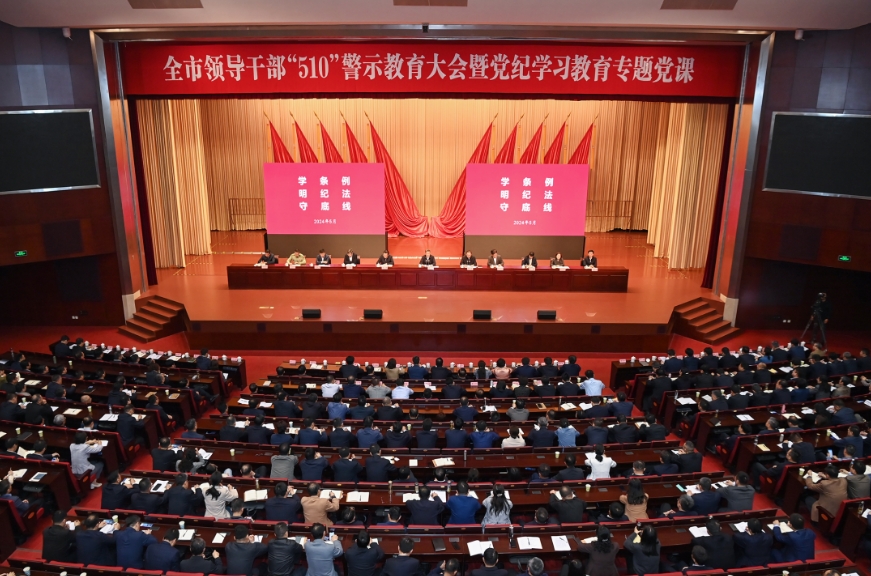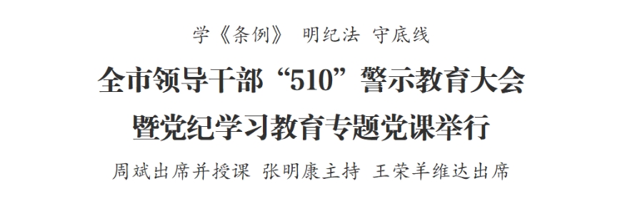 5月10日,全市領(lǐng)導(dǎo)干部“510”警示教育大會(huì)暨黨紀(jì)學(xué)習(xí)教育專題黨課舉行,深入學(xué)習(xí)習(xí)近平總書記關(guān)于黨的自我革命的重要思想,全面落實(shí)黨中央和省市委關(guān)于黨紀(jì)學(xué)習(xí)教育的部署要求,深化以案為鑒、以案明紀(jì)、以案促改,推動(dòng)全市黨員干部和公職人員認(rèn)真學(xué)習(xí)《中國(guó)共產(chǎn)黨紀(jì)律處分條例》,真正做到學(xué)紀(jì)、知紀(jì)、明紀(jì)、守紀(jì),為推進(jìn)中國(guó)式現(xiàn)代化鹽城新實(shí)踐提供堅(jiān)強(qiáng)紀(jì)律保障。市委書記周斌出席并講授黨紀(jì)學(xué)習(xí)教育專題黨課。市委副書記、市長(zhǎng)張明康主持,市人大常委會(huì)主任王榮、市政協(xié)主席羊維達(dá)出席。