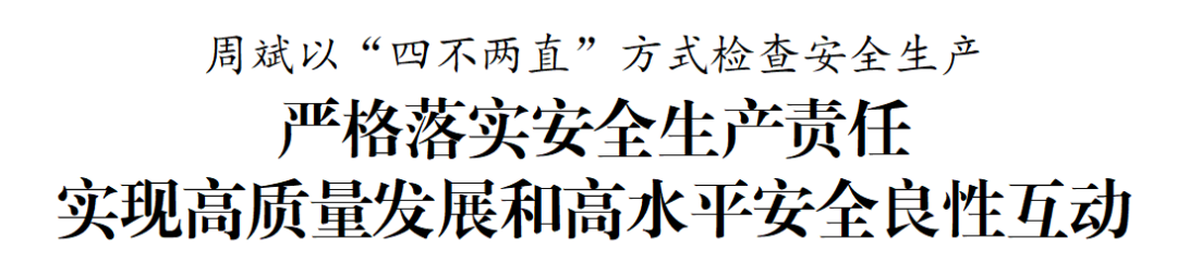 周斌在調(diào)研中強(qiáng)調(diào),安全生產(chǎn)工作須臾不可懈怠、絲毫不可放任、時(shí)刻不可松勁。各地各部門(mén)要進(jìn)一步抬高政治站位,堅(jiān)持黨政同責(zé)、一崗雙責(zé)、齊抓共管、失職追責(zé),全面推進(jìn)安全生產(chǎn)治本攻堅(jiān)三年行動(dòng),做到主動(dòng)發(fā)現(xiàn)問(wèn)題、及時(shí)解決問(wèn)題,不斷提升本質(zhì)安全水平,保障人民群眾生命財(cái)產(chǎn)安全,為勇當(dāng)發(fā)展新質(zhì)生產(chǎn)力重要陣地“碳路先鋒”提供有力支撐。